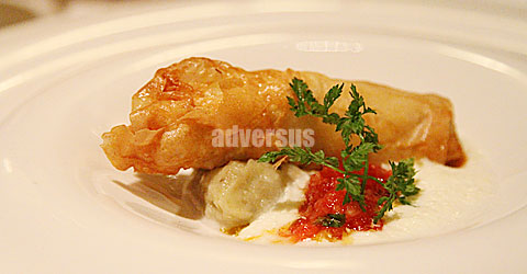 This was followed byRock Lobster Tail Fried in Fillo Pastry, Mousse of Aubergine & Cream of Mozzarella. A very crispy spring-roll: the flavour of the shrimp tails merges perfectly with the aubergine and mozzarella.